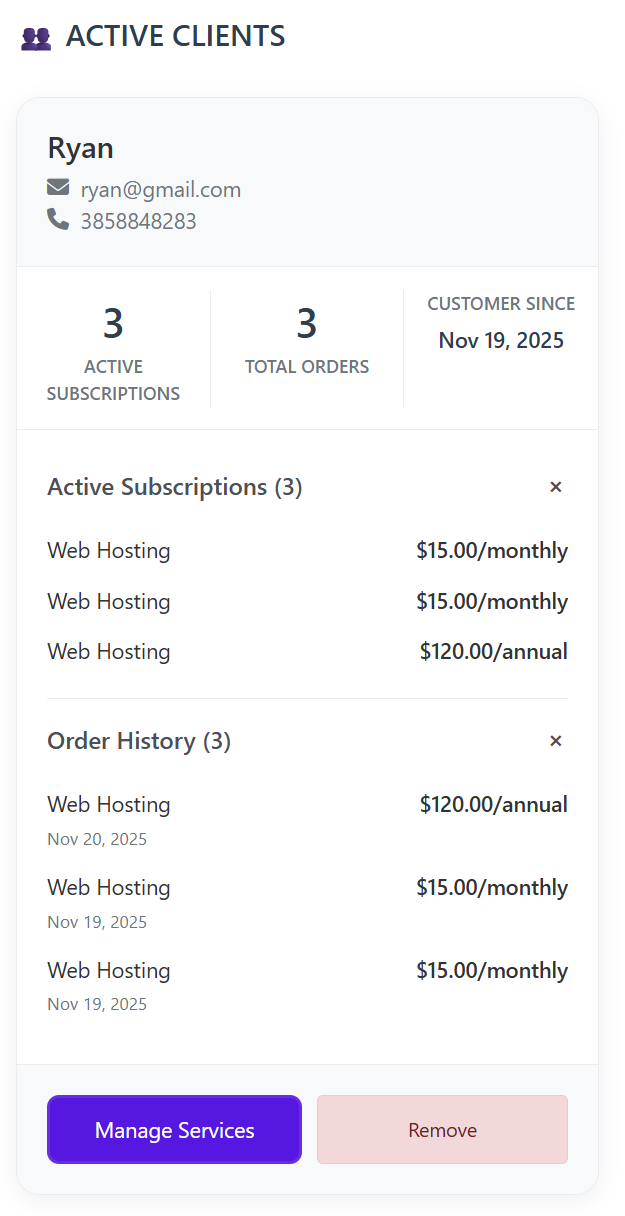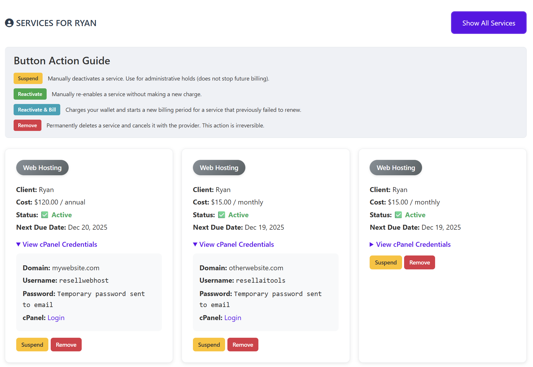 ResellPortal makes it easy to manage your customers and the services connected to them. The Clients and Services sections in your dashboard give you complete control over accounts, subscriptions, and access details.