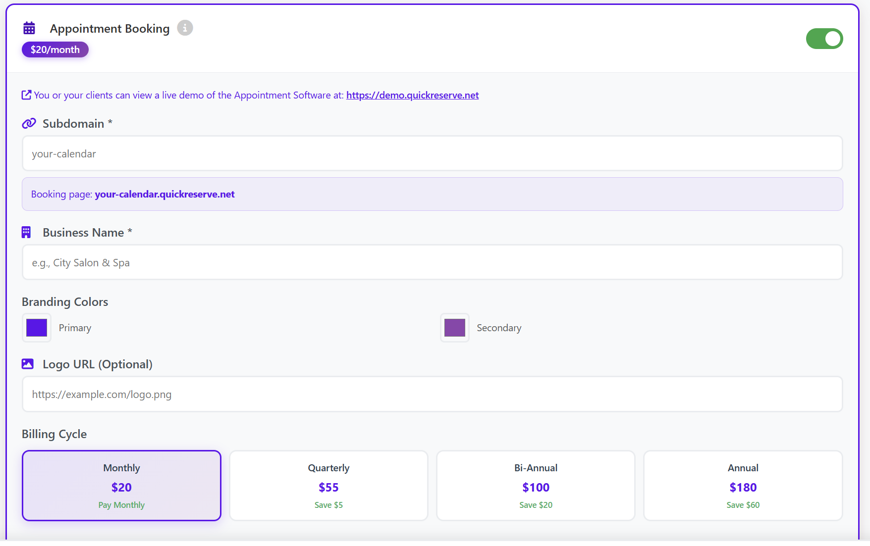 • Subdomain: Choose a unique prefix for your client's booking topic (e.g., your-client-name). The final URL will look like your-client-name.quickreserve.net.