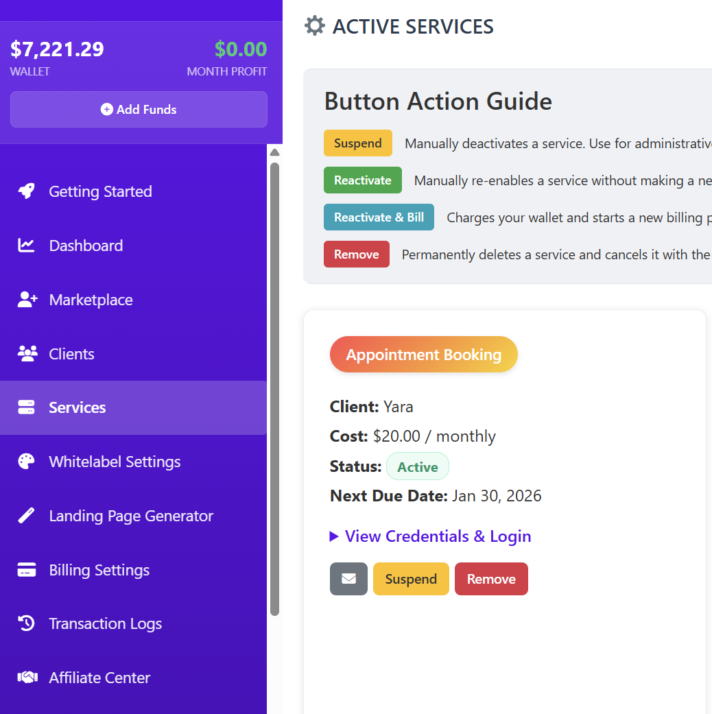 • Status Tracking: You can monitor the service status (Active/Suspended), check the next due date, or remove the service if needed.