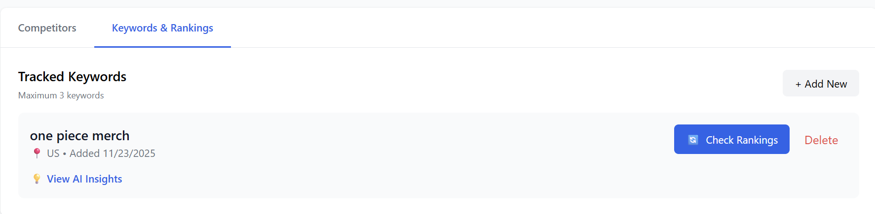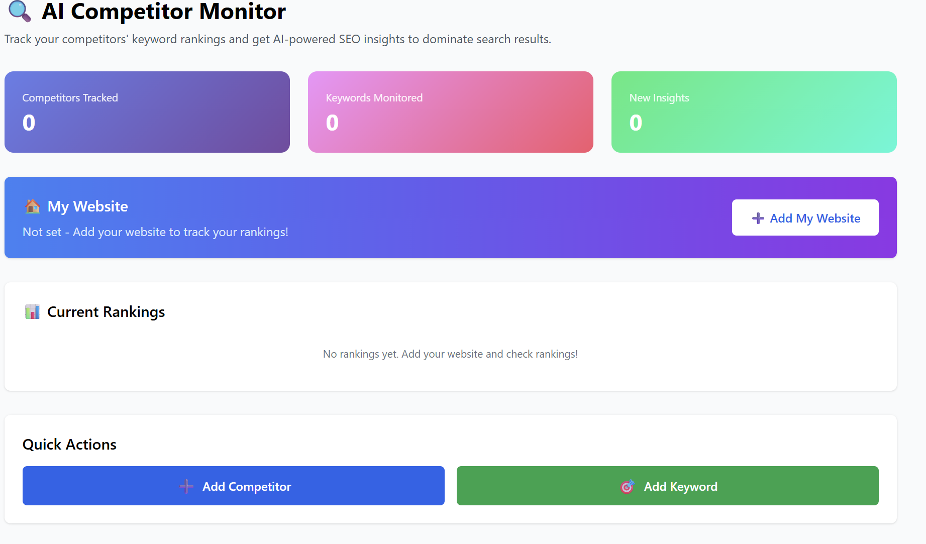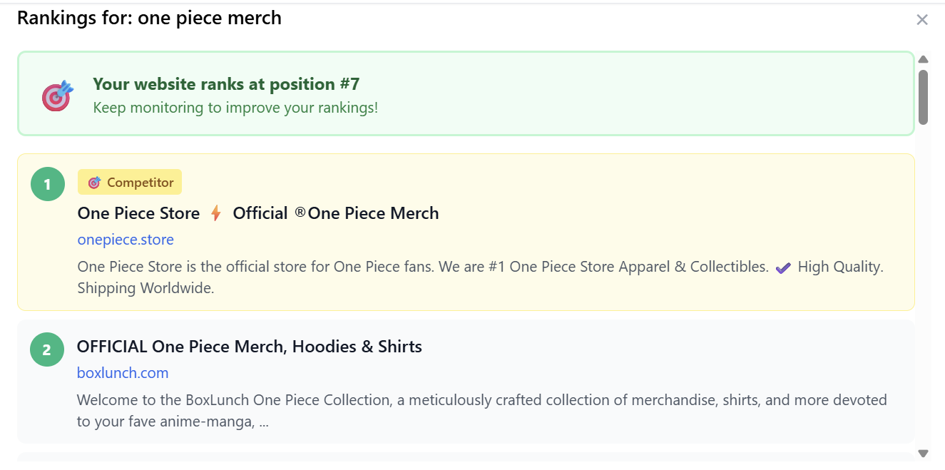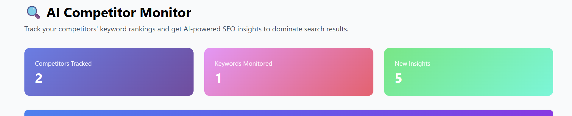 The AI Competitor Monitor helps you track your competitors’ keyword rankings and receive AI-powered insights to improve your SEO strategy and outperform them in search results.