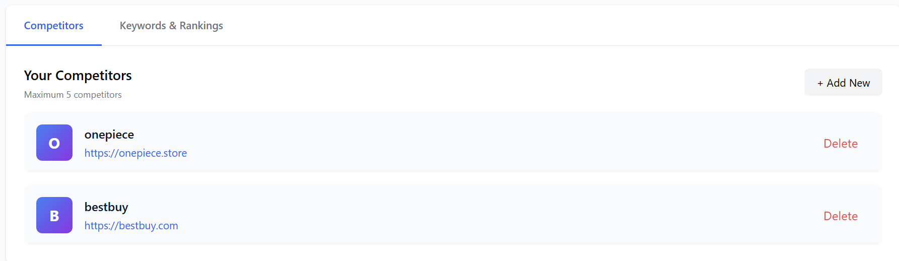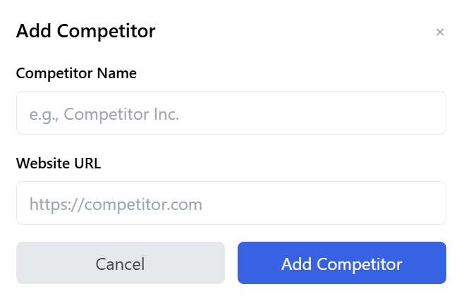 and you can add New Competitor, just enter the website name & URL, then the AI begins tracking: