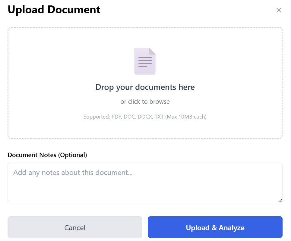 When a user clicks "Upload Document," the AI goes to work. For every file uploaded (such as a .txt.pdf, or .docx), the system automatically identifies: