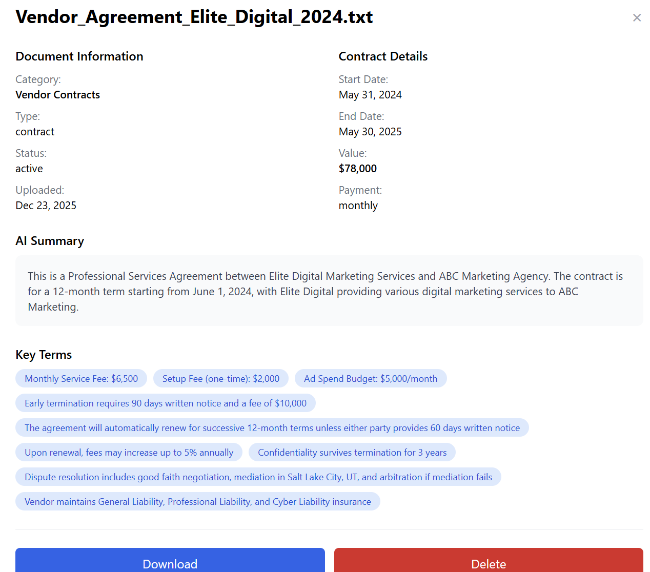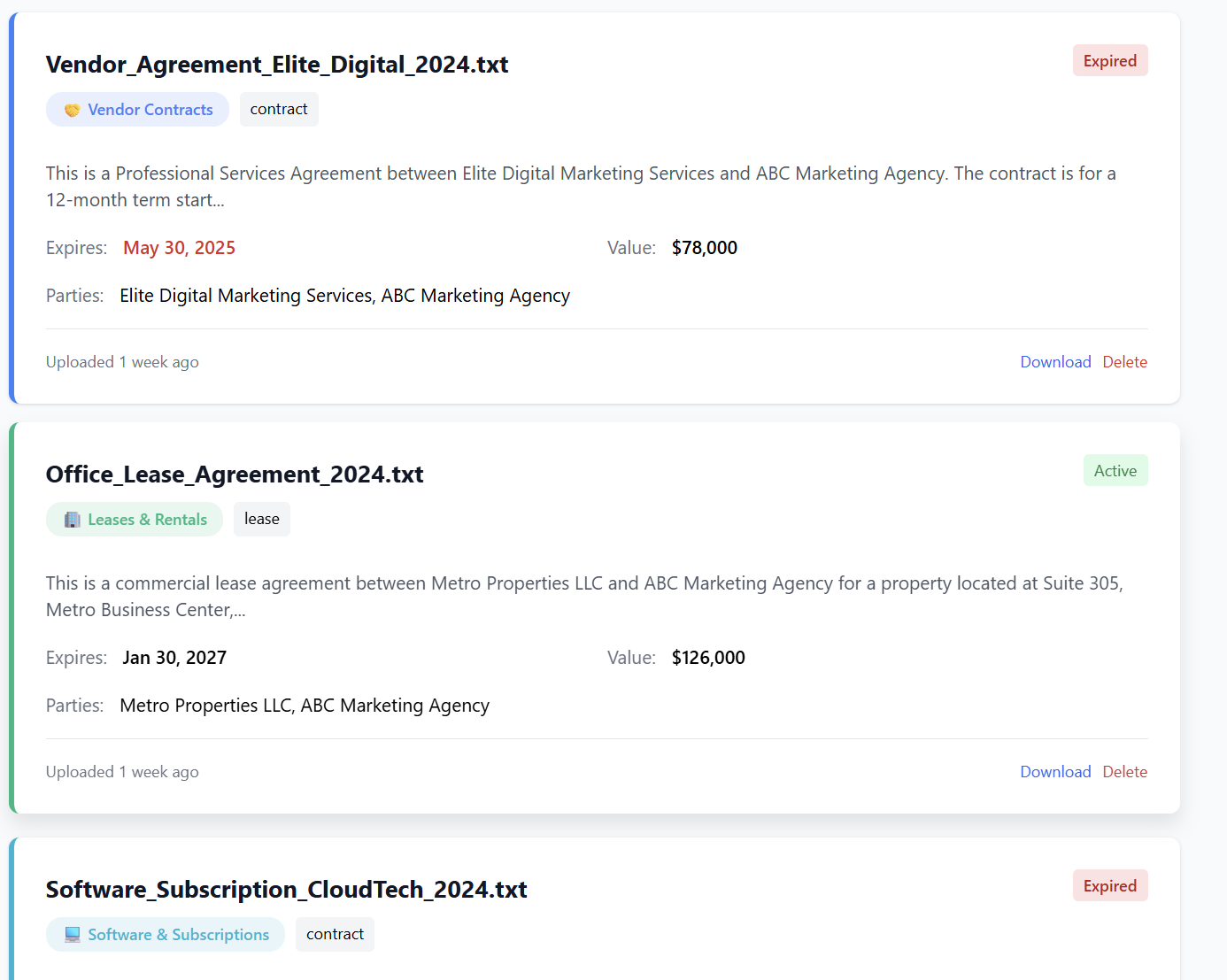 The AI Contract & Document Manager is an intelligent repository that does more than just store files. Using advanced AI, it scans uploaded documents to extract key dates, financial values, and involved parties, providing a high-level overview of a business's contractual health.
