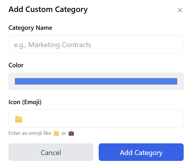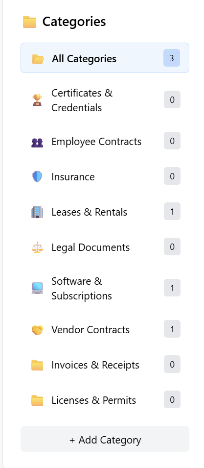 • Custom Categories: Users are not limited to the defaults. Click "+ Add Category" to create custom folders tailored to a specific business niche.
