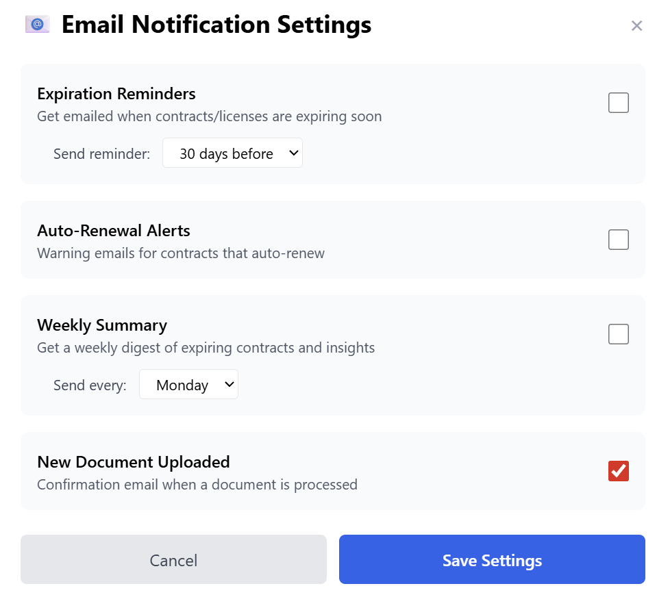 • Upload Confirmations: Receive an email as soon as the AI has finished processing and "reading" a newly uploaded document.