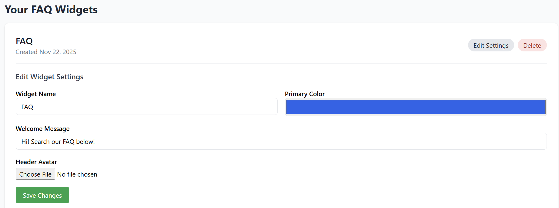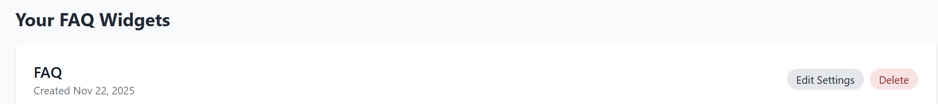 Your new FAQ widget will appear under Your FAQ Widgets, showing: