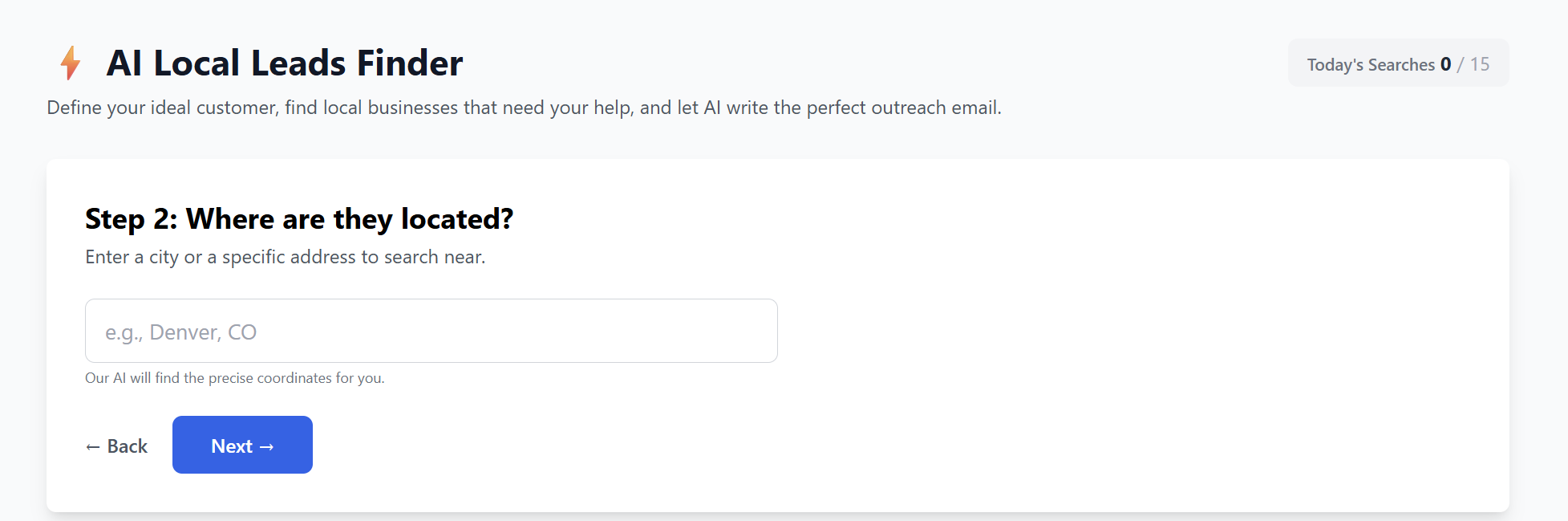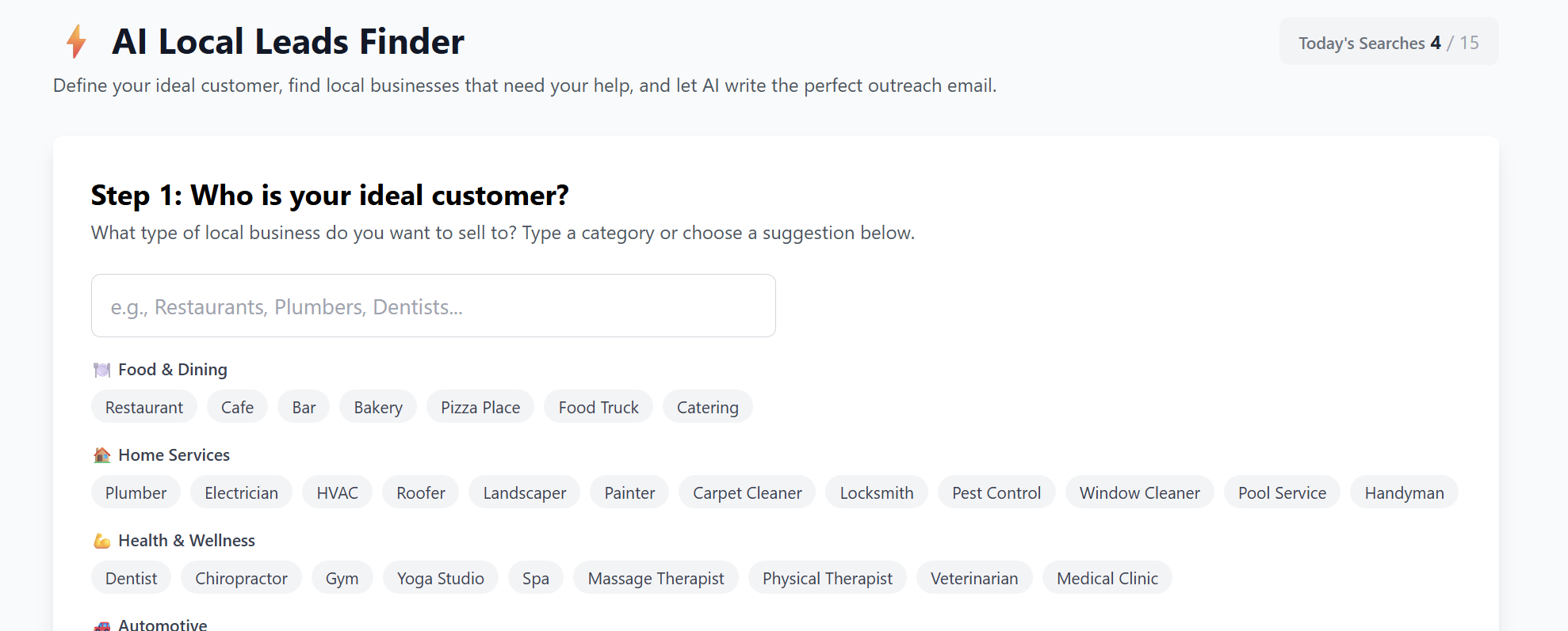 The AI Local Leads Finder helps you discover local businesses that match your ideal customer profile, identify pain points they’re struggling with, and automatically generate high-converting outreach emails.
