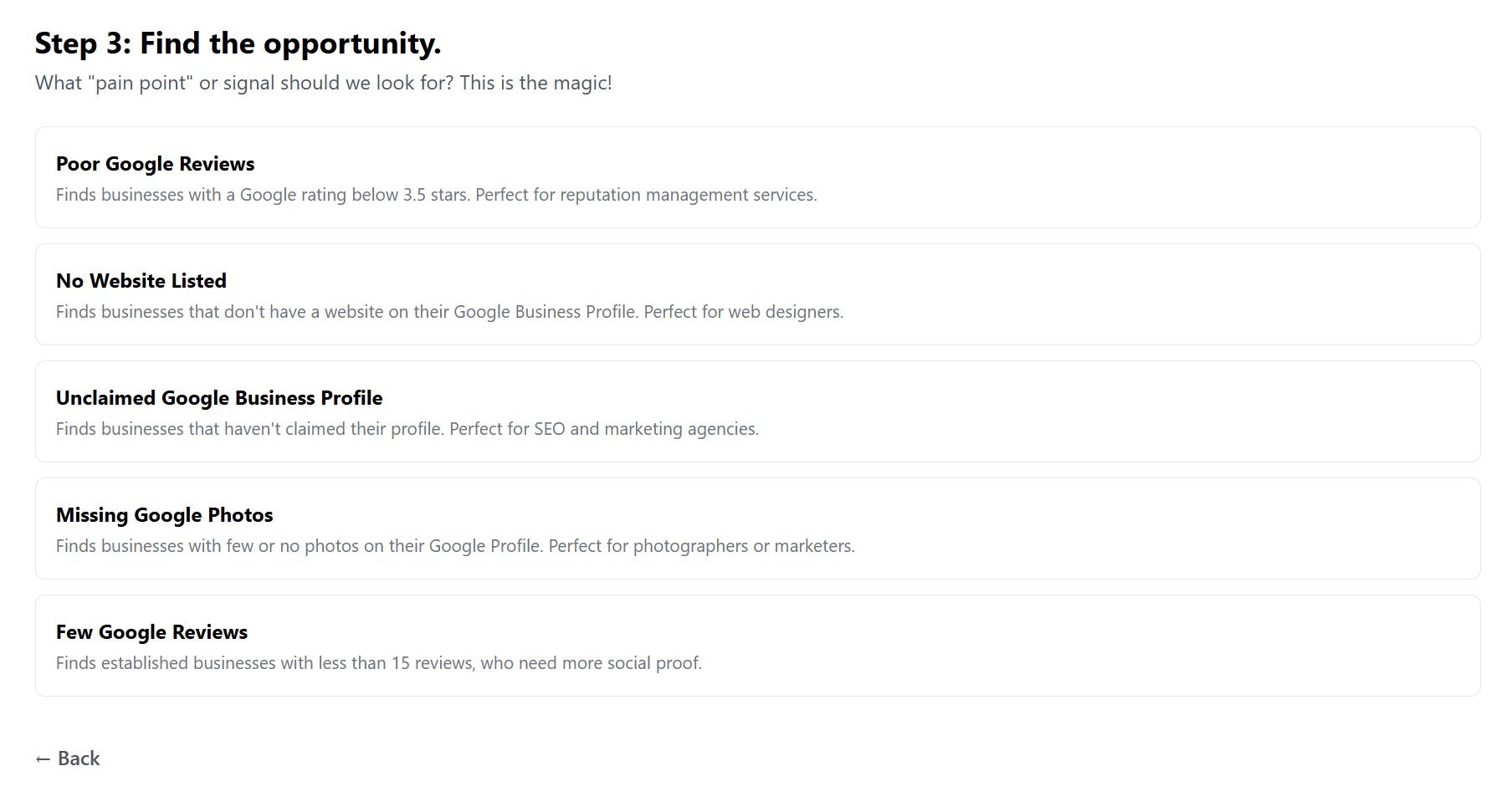 Targets established businesses with less than 15 reviews — perfect for review growth services.