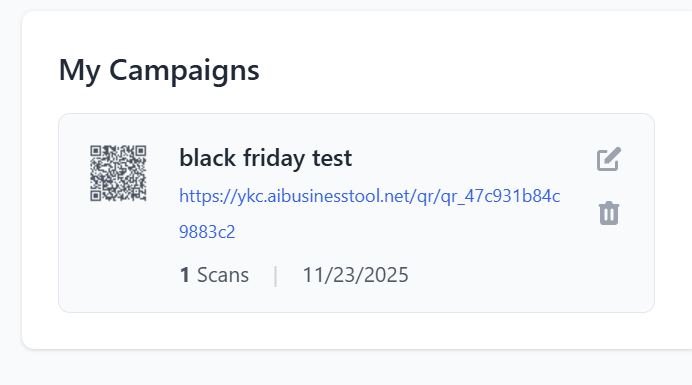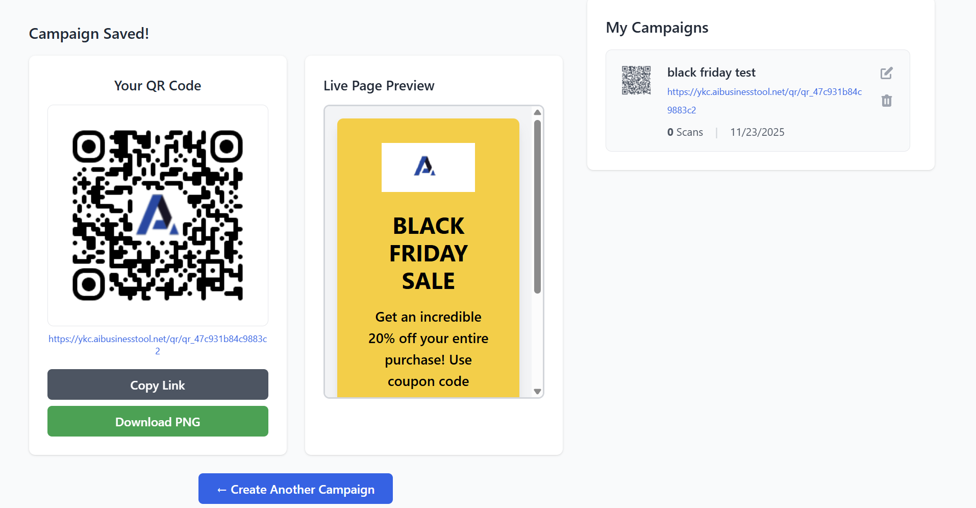 Once created, campaigns are saved inside your “My Campaigns” dashboard with analytics such as scans and activation status.