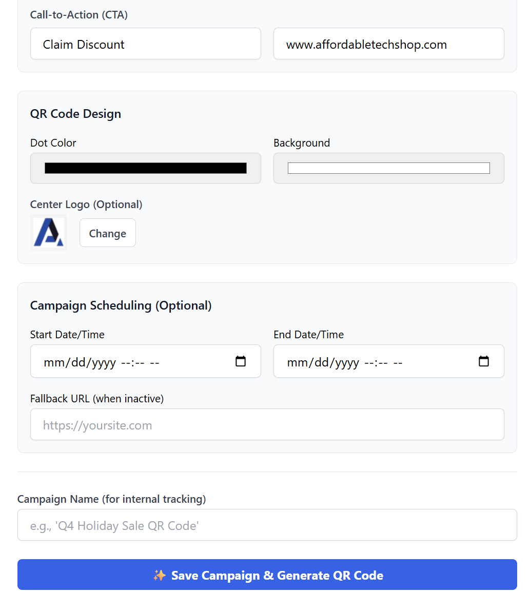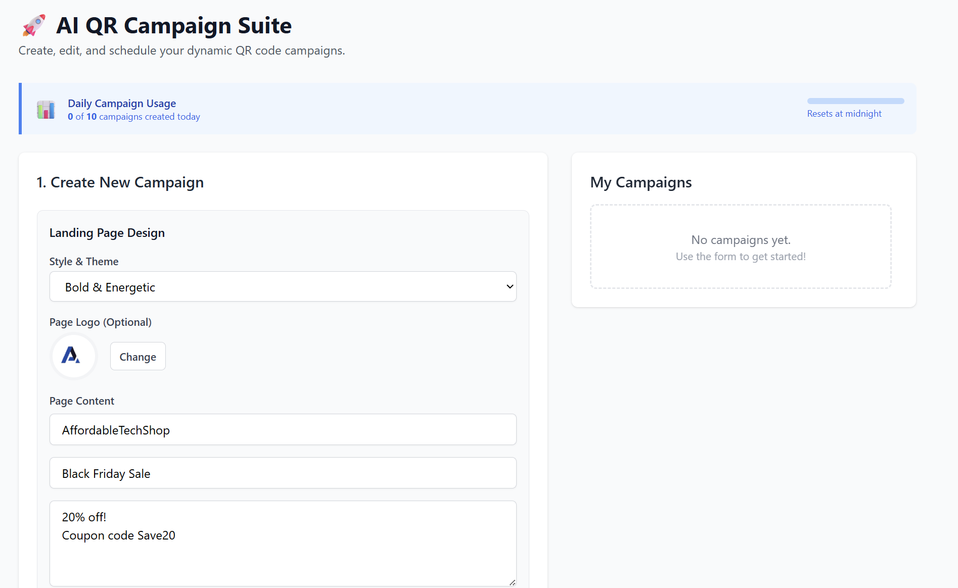 Inside the AI QR Suite, you'll see the Create New Campaign section. Follow the steps below: