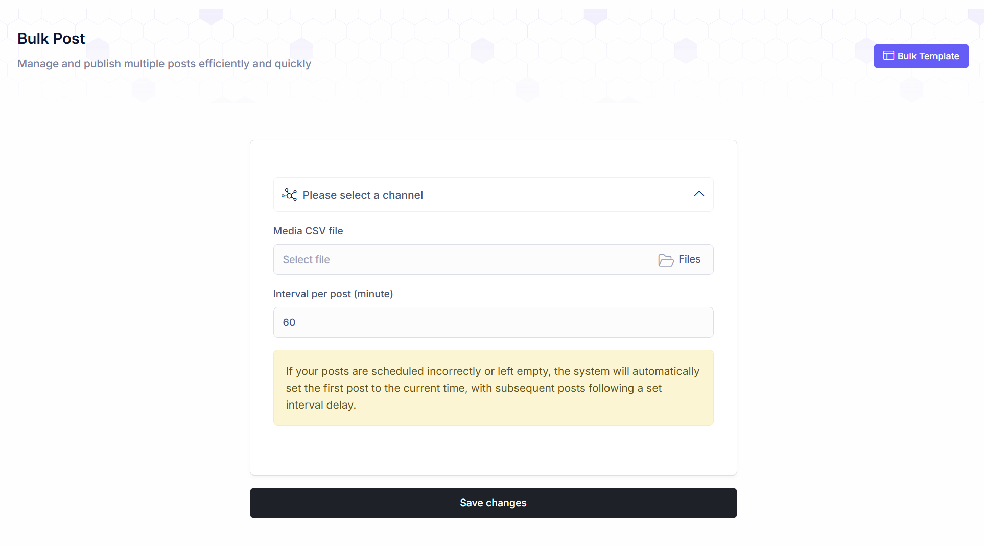 Bulk Posts: Efficiently upload dozens of posts at once. Users can download a Bulk Template, upload a media CSV file, and set an Interval per post (in minutes) to avoid spam filters.