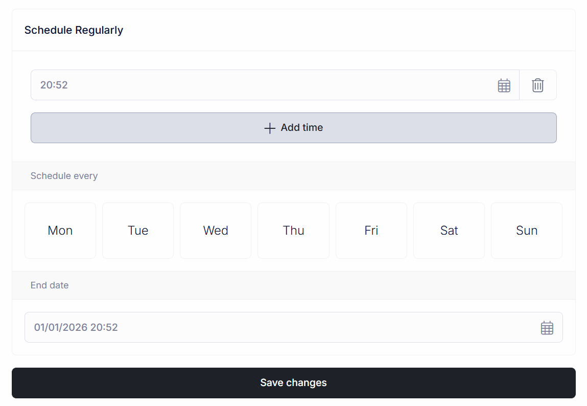 Scheduling: Set the regularity of the campaign by choosing specific dates, days, and times for the AI to publish automatically.