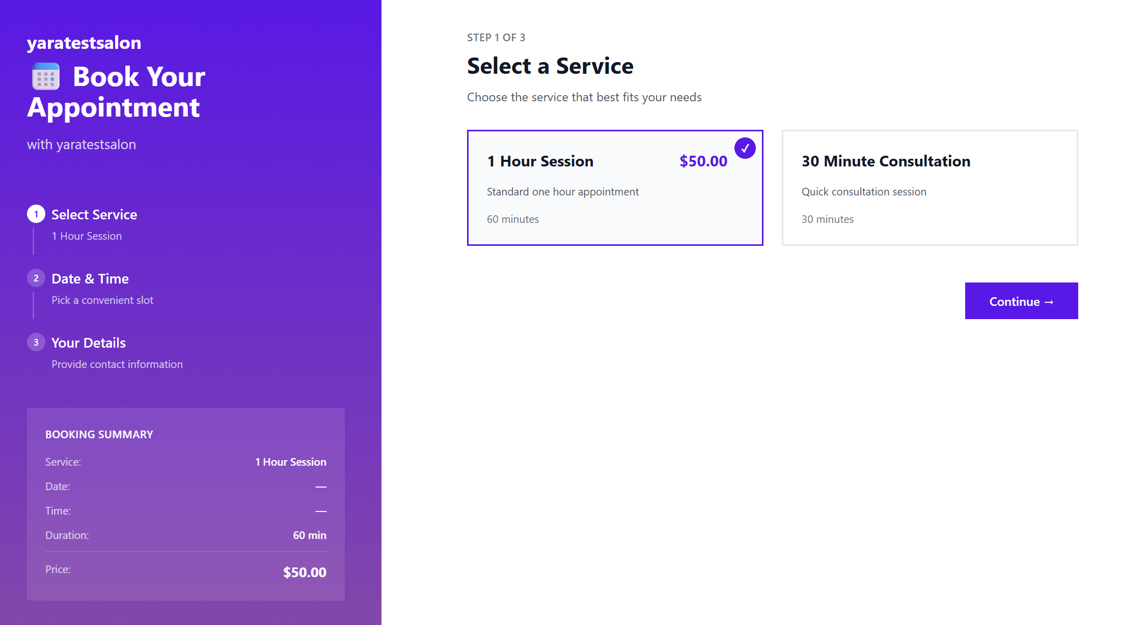 Real-time Booking Summary: As the customer makes selections, the "Booking Summary" in the sidebar updates automatically with the service name, duration, and price.