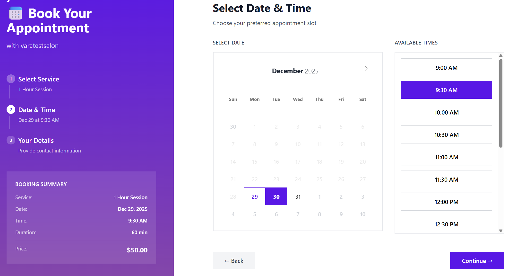 Select Time: Once a date is chosen, the available time slots appear on the right.