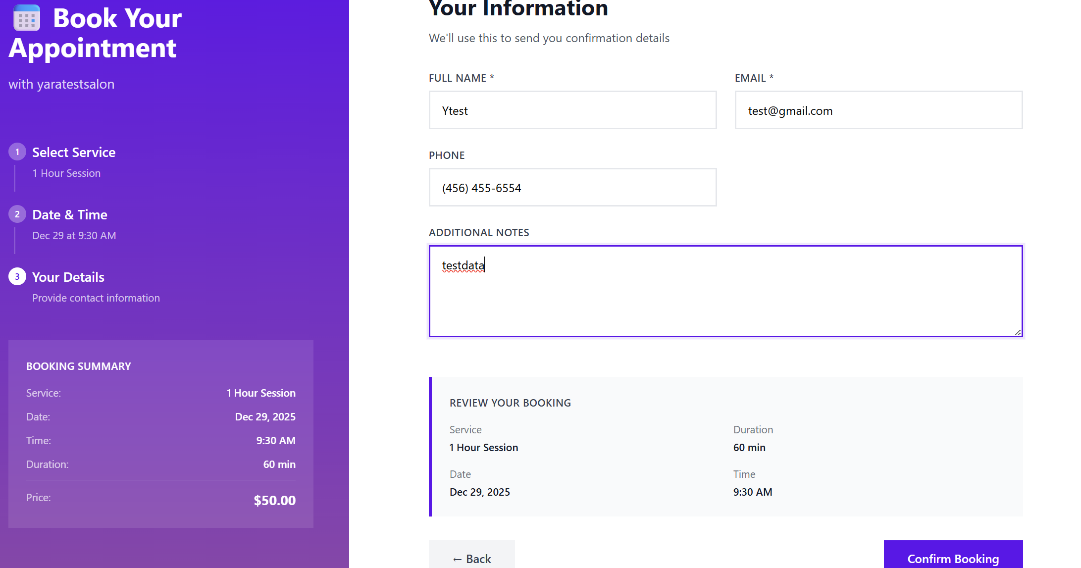 This streamlined, mobile-responsive flow ensures that your clients' customers can book appointments in under 60 seconds. All bookings made here will immediately appear in your client's Admin Dashboard (as seen in Phase 2) for management and tracking.