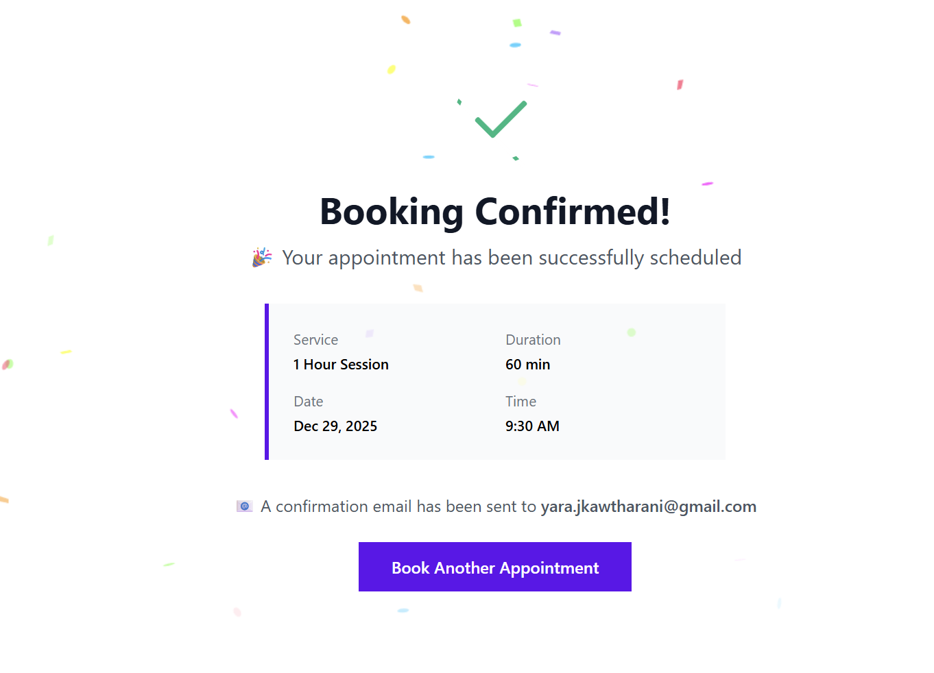 Automated Email: The system instantly sends a professional confirmation email to the address provided by the customer.
